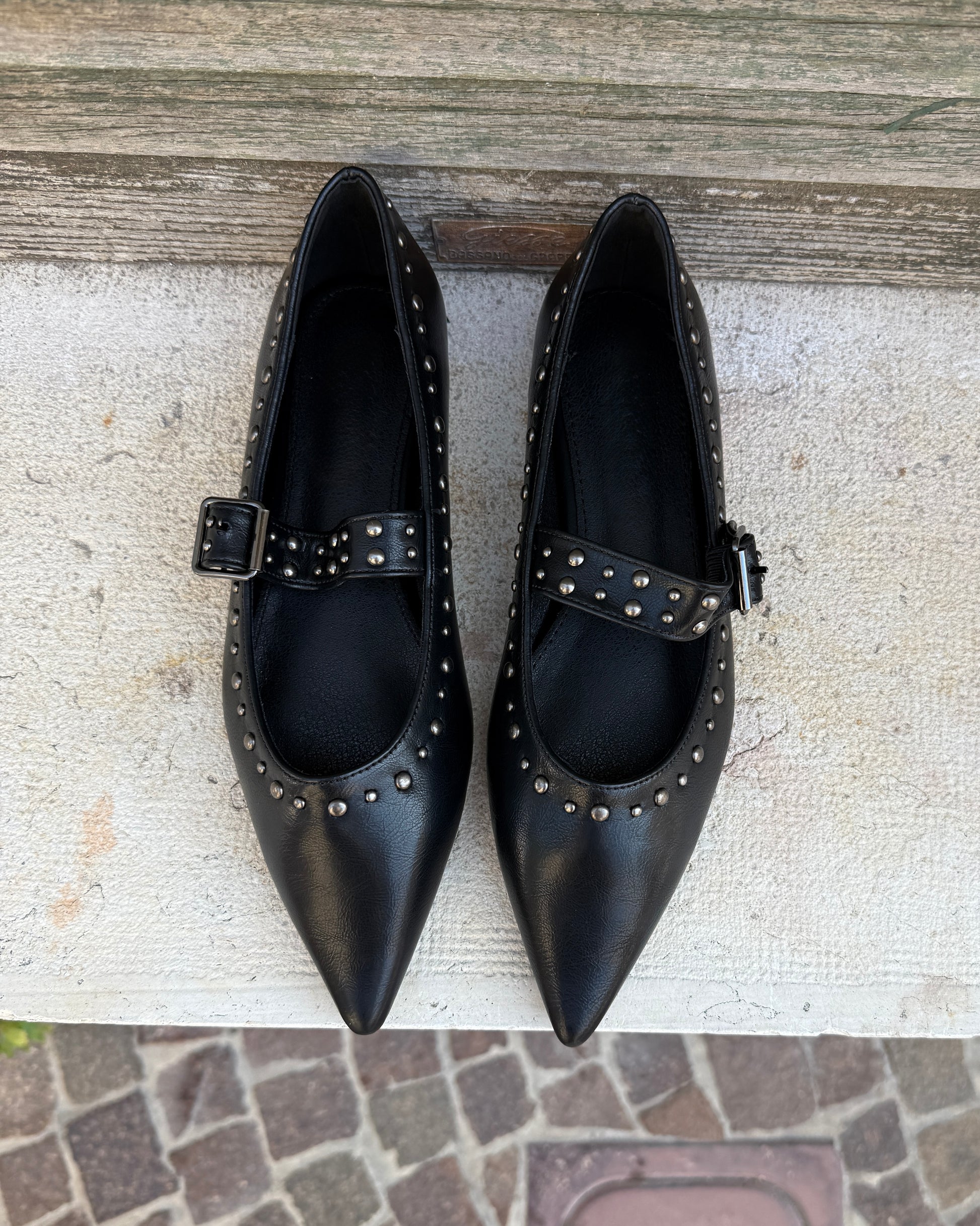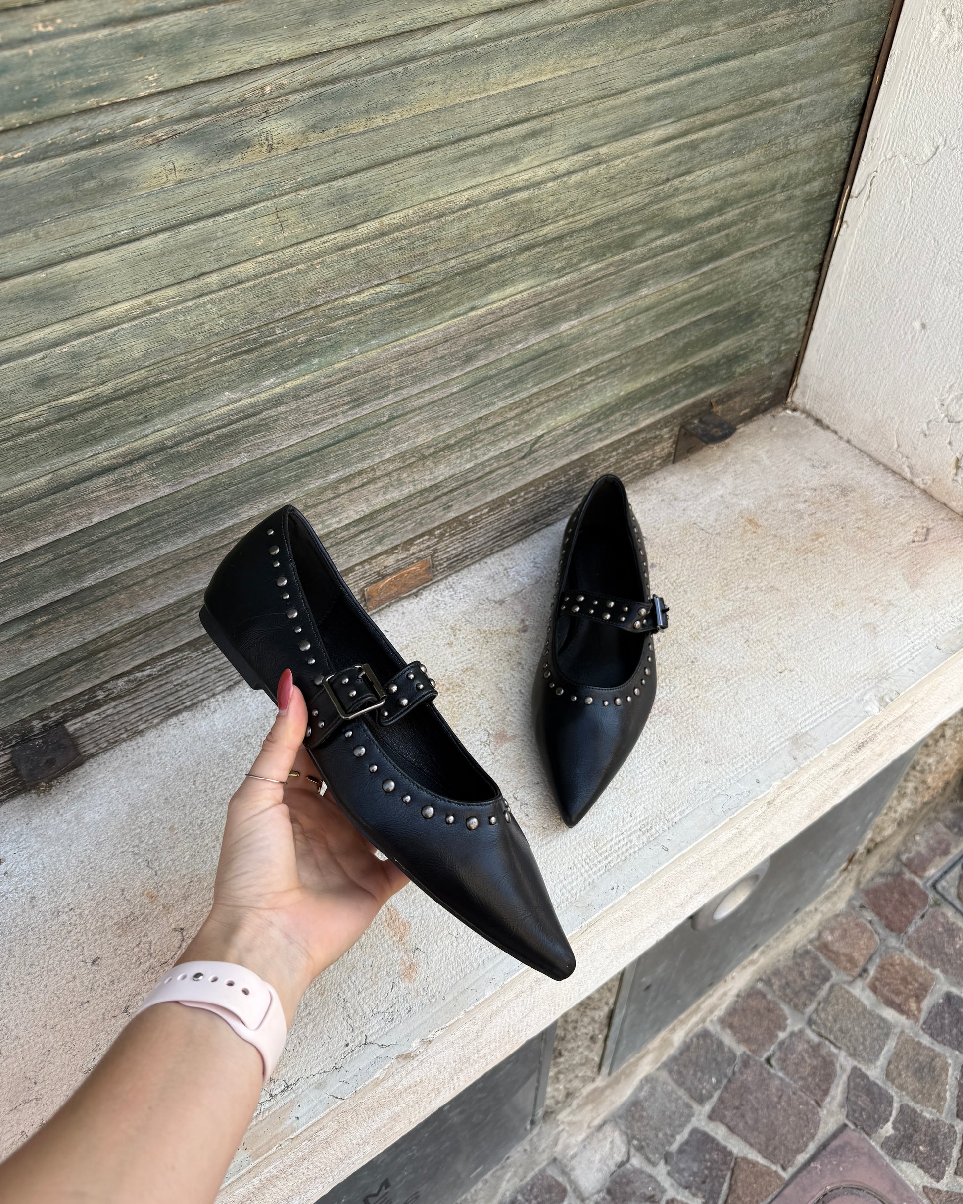 Le Ballerine Julia uniscono un tocco giocoso a uno stile deciso grazie alle borchiette trendy e alla fibbia chic. Perfette per chi vuole camminare con leggerezza senza rinunciare a un dettaglio vivace e originale.