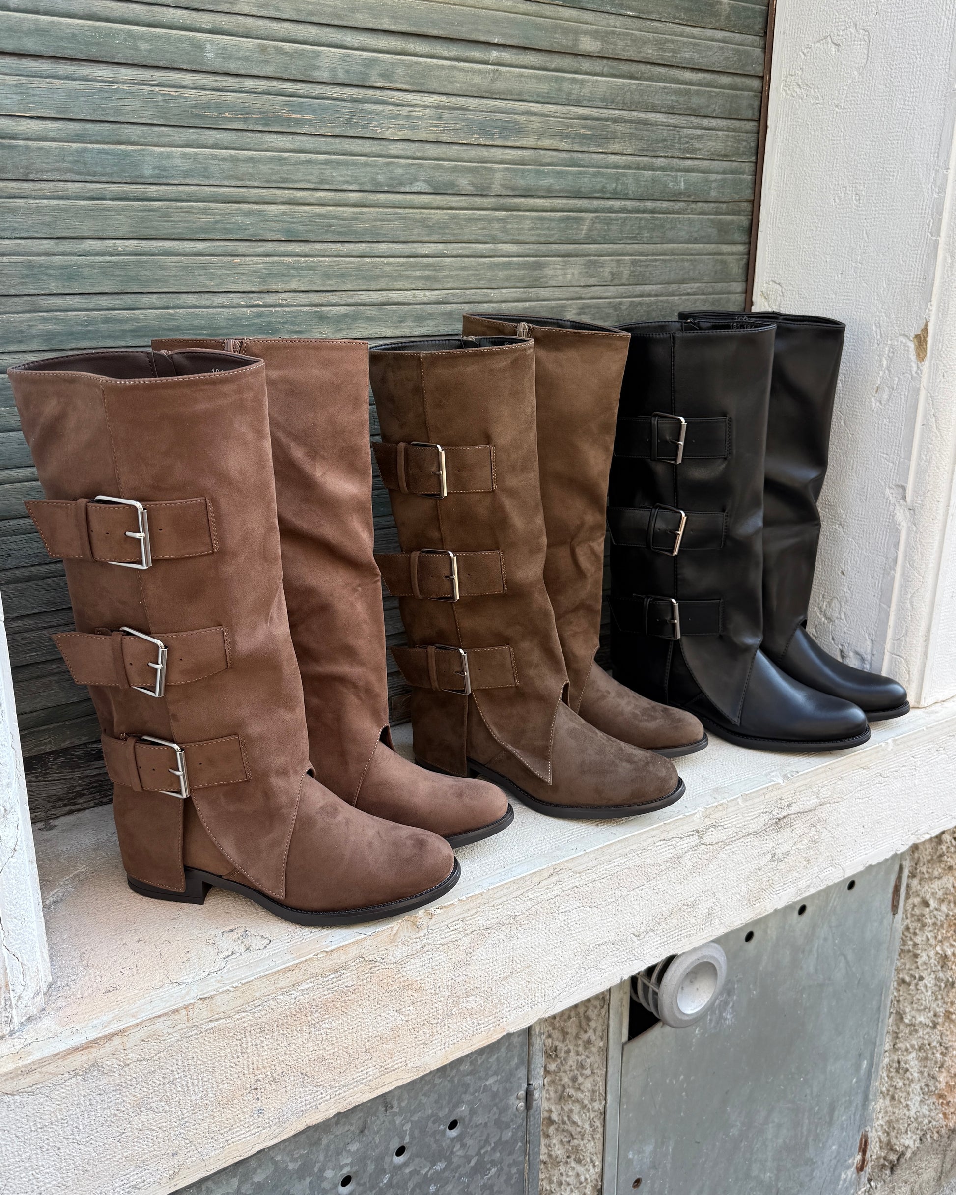 Lo Stivale Colonia unisce design sofisticato e funzionalità: l’effetto scamosciato conferisce una texture elegante e raffinata, mentre le fibbie regolabili assicurano una calzata personalizzata. La cerniera interna facilita l’uso e garantisce un aspetto pulito senza interruzioni esterne. Un modello ideale per chi cerca un equilibrio tra stile ricercato e praticità quotidiana.