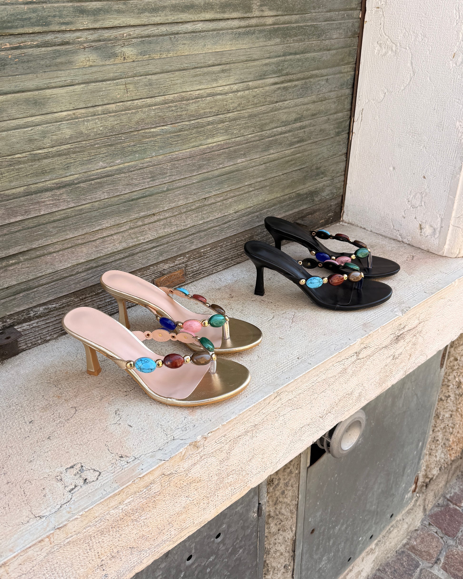 Senti il bisogno di aggiungere un po’ di "wow" al tuo passo? Ecco il Tacco Ariel! Questa ciabatta infradito con tacco e perle colorate è come una festa per i tuoi piedi! Comfort e stile si uniscono per farti brillare (letteralmente)! Pronta per ballare?